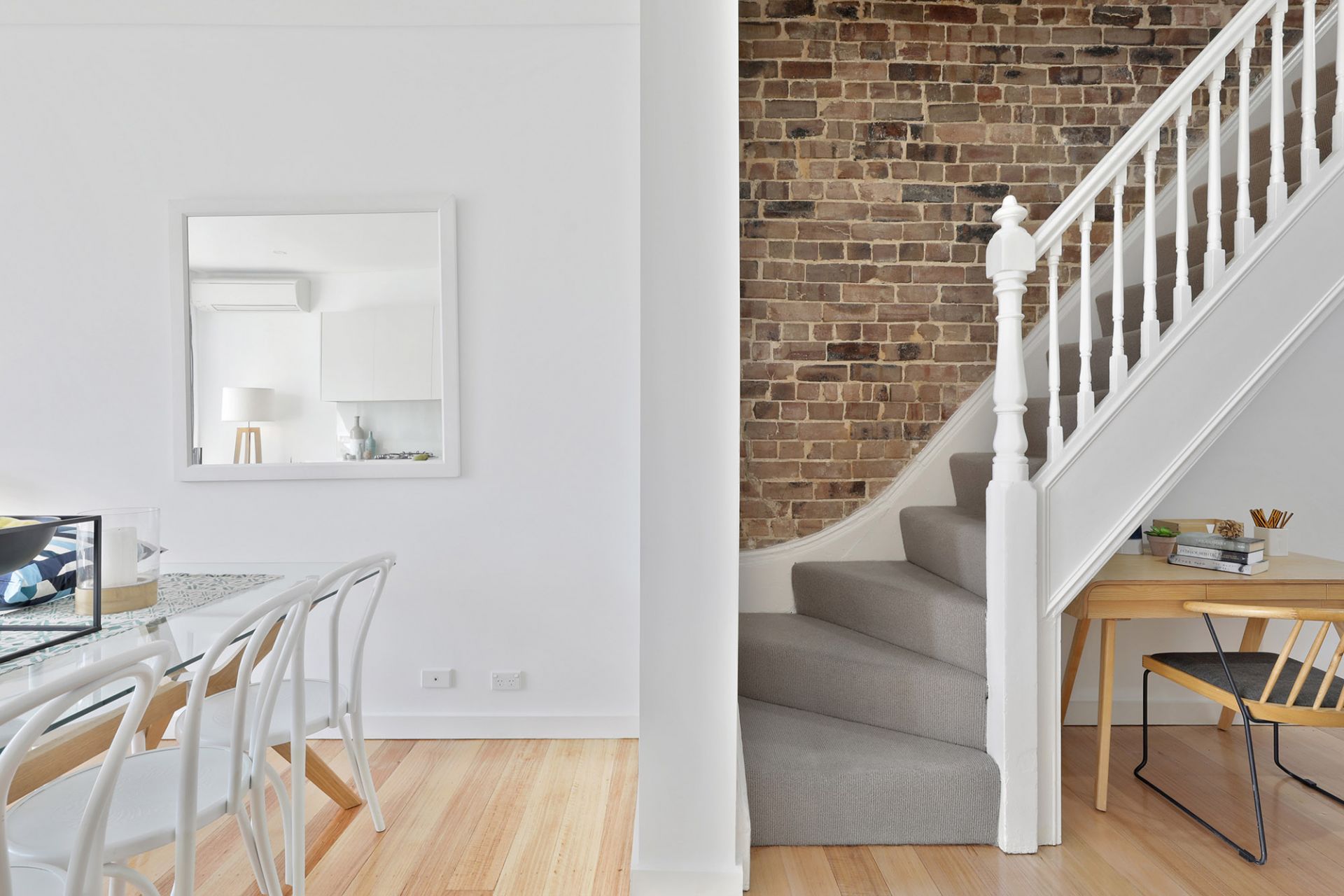 – High decorative ceilings, exposed brick wall along staircase
