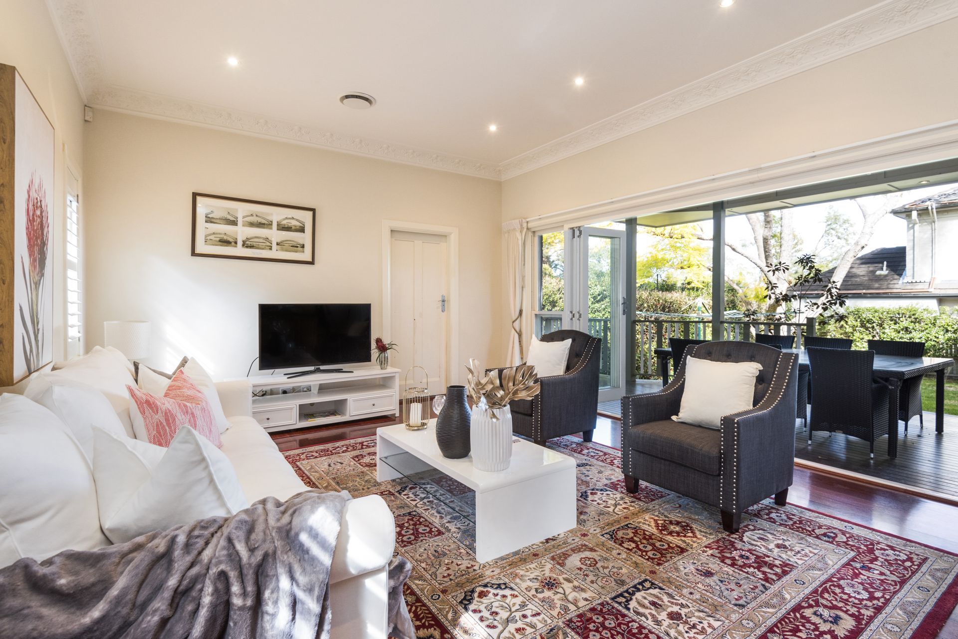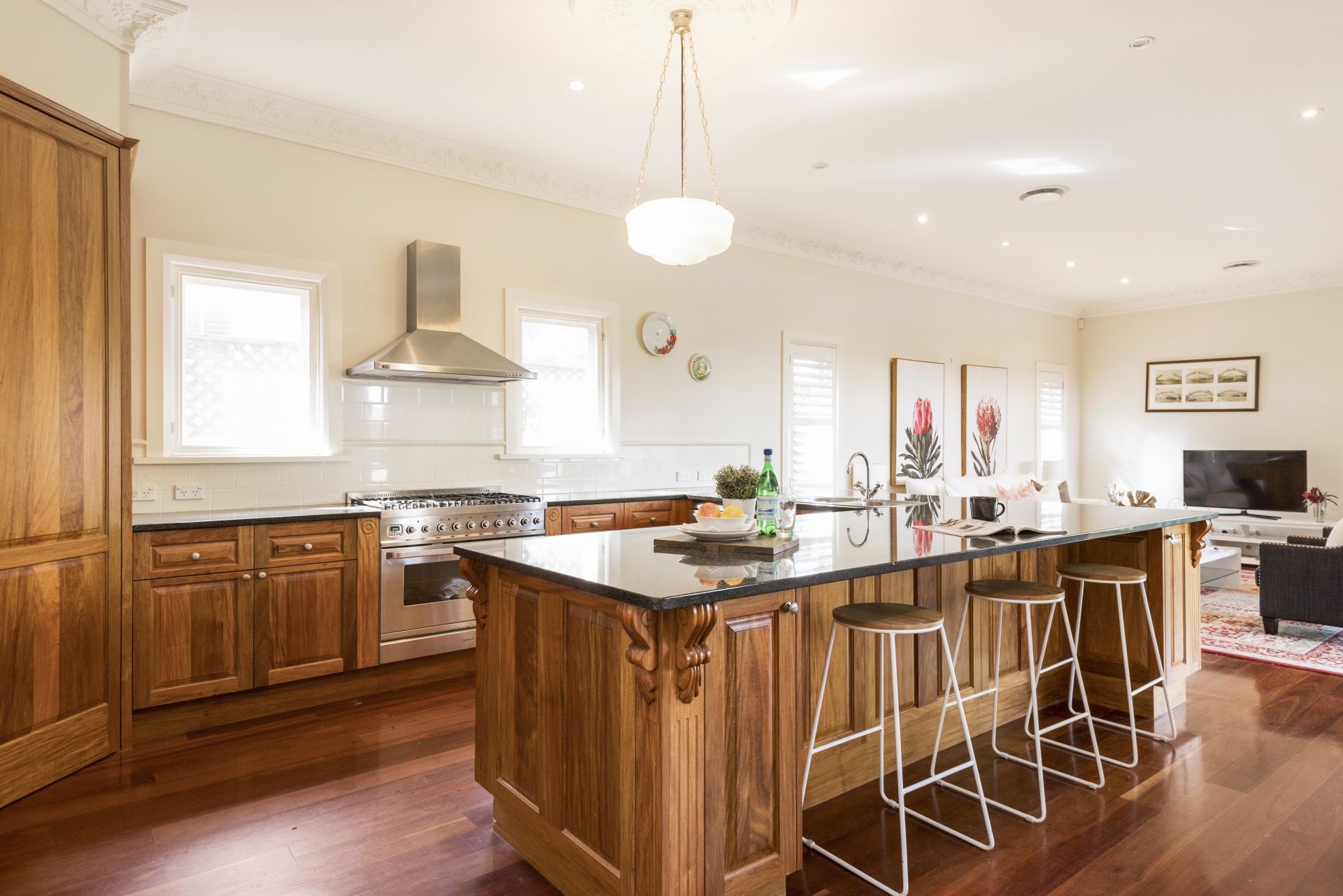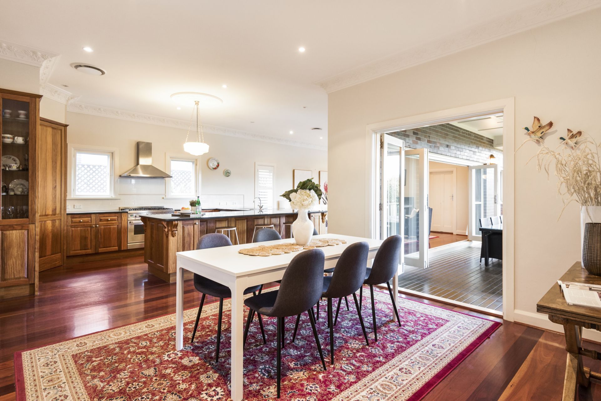 The home offers four generous sized bedrooms, including a master with walk-in-robe and en-suite, as well as a separate study and two additional bathrooms that have been renovated with classic, quality finishes. The beautiful, original formal dining and lounge room, complete with gas fire, give a sense of style and elegance reflecting the property’s 1920’s heritage. They are perfectly complemented by the spacious open plan lounge/dining and adjoining bespoke timber kitchen, with granite benchtops and breakfast bar, that provide the ideal casual living space. Bi-fold doors create effortless flow to a large alfresco entertaining area overlooking private, low maintenance gardens with level lawns and established hedges.