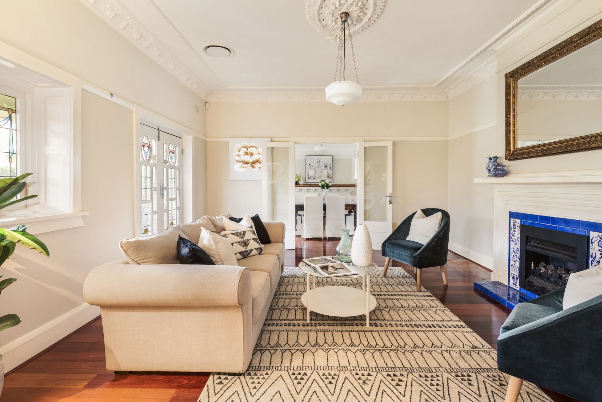 A covered porch leads you into the charming entry foyer, revealing elegant period features such as high patterned ceilings, detailed timberwork, enchanting leadlight windows, pendant light fittings and polished timber floors.